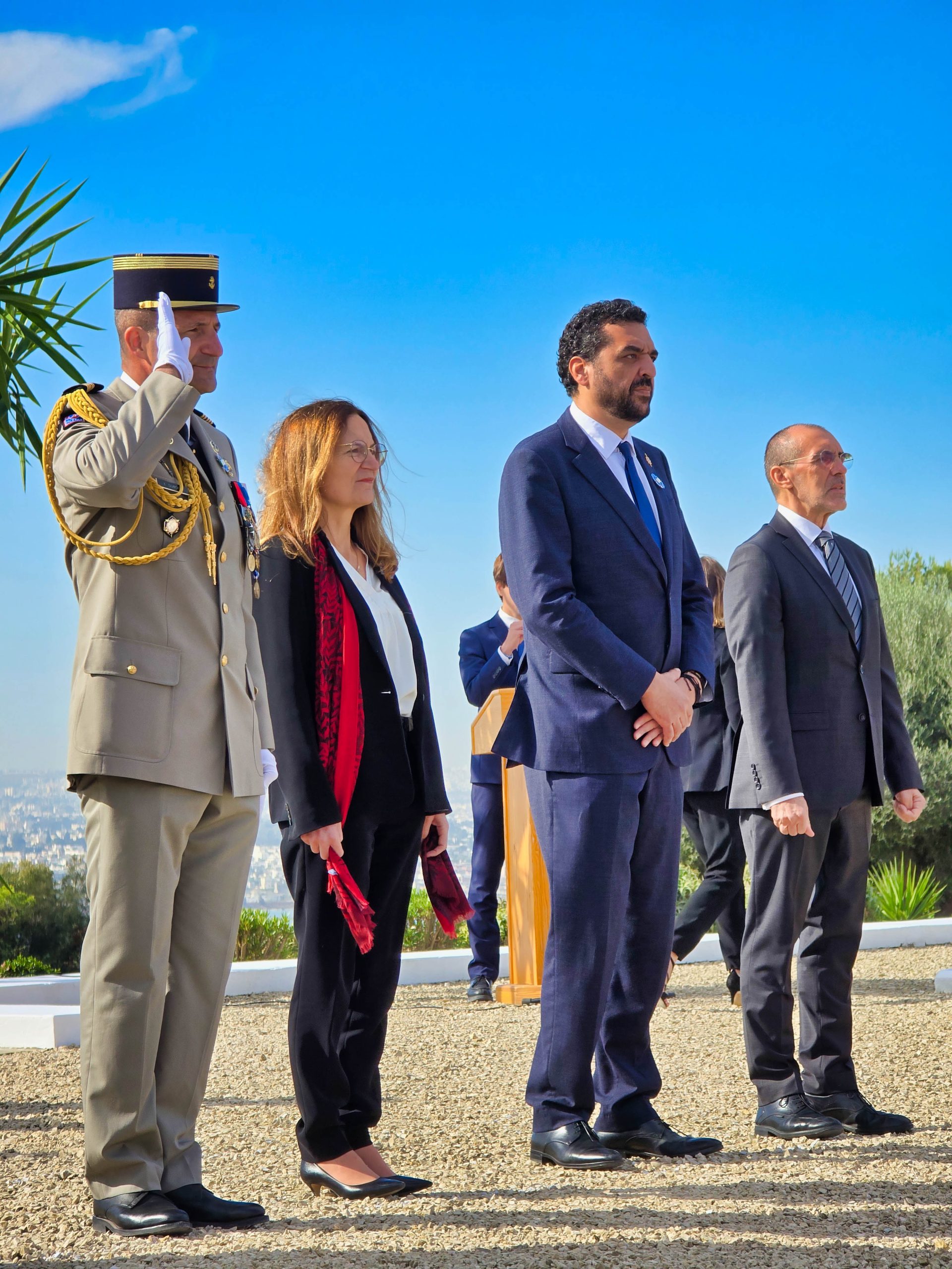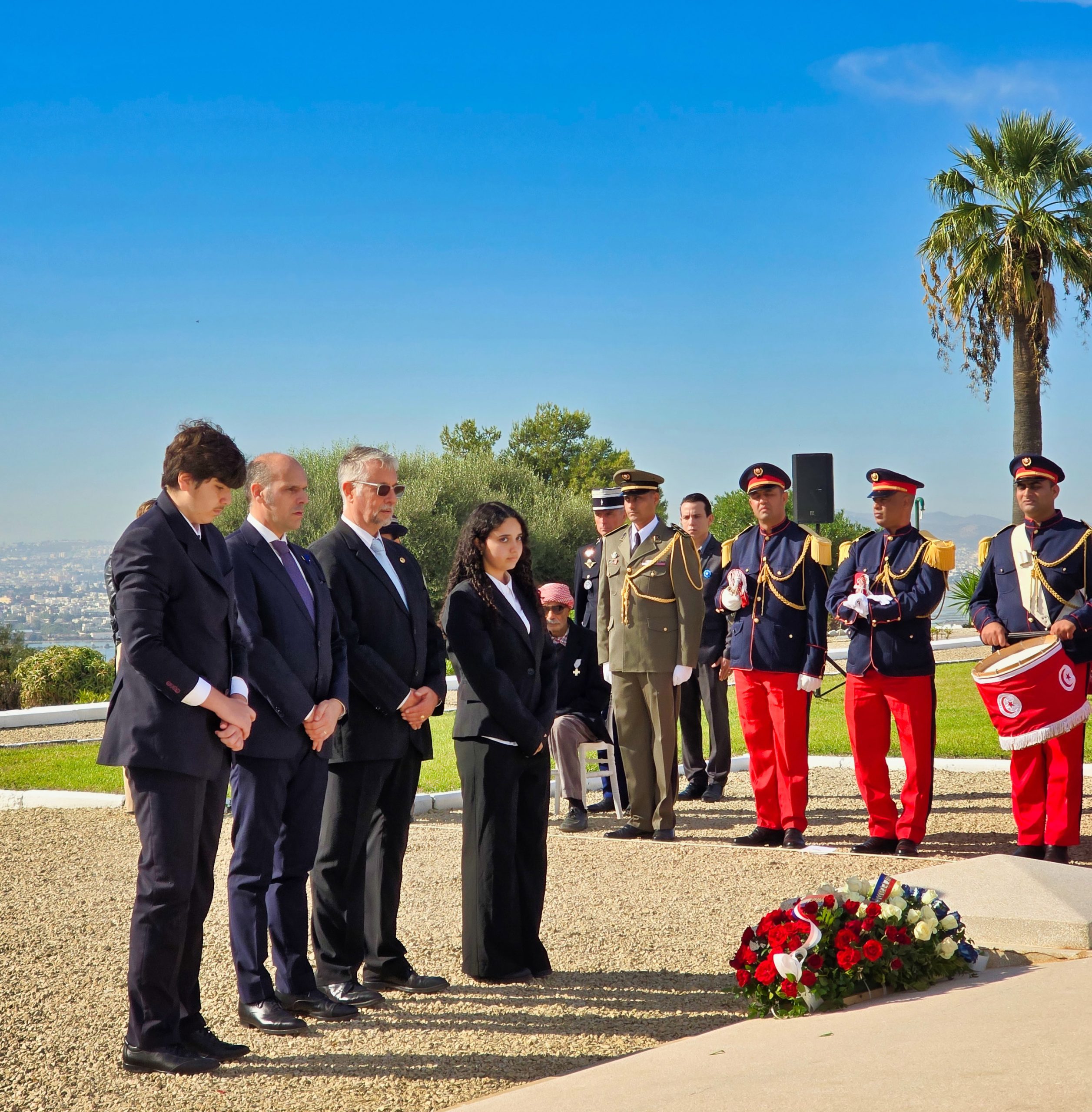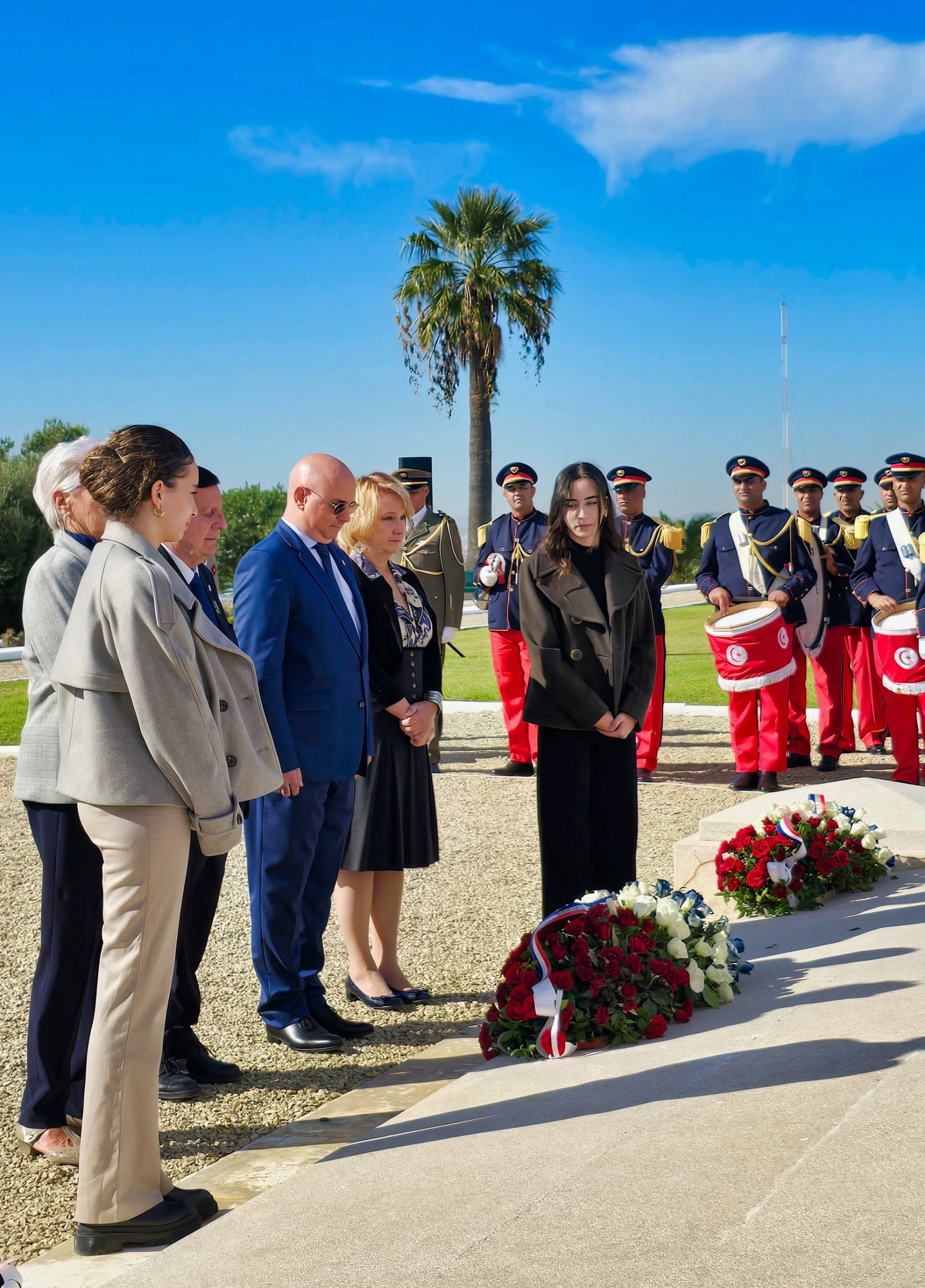 En ce 11 novembre 2025, le cimetière militaire français de Gammarth a accueilli une cérémonie empreinte d’émotion et de recueillement, en présence de Mme Anne Guéguen, Ambassadrice de France en Tunisie, de M. Dominique MAS, Consul de France en Tunisie, ainsi que du député des Français établis hors de France pour la 9e circonscription, M. Karim Ben Cheikh, ancien élève du Lycée Gustave Flaubert (La Marsa).
