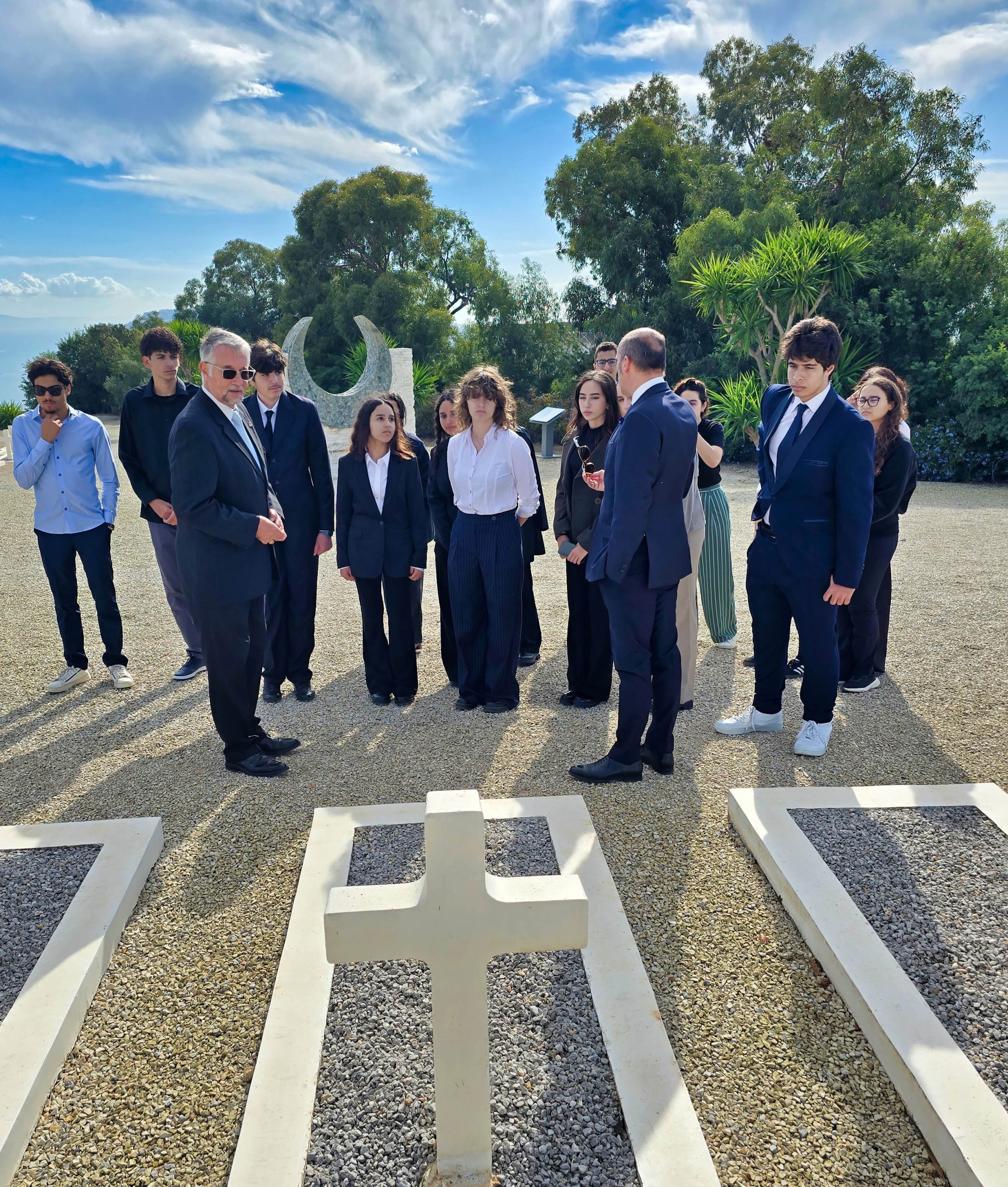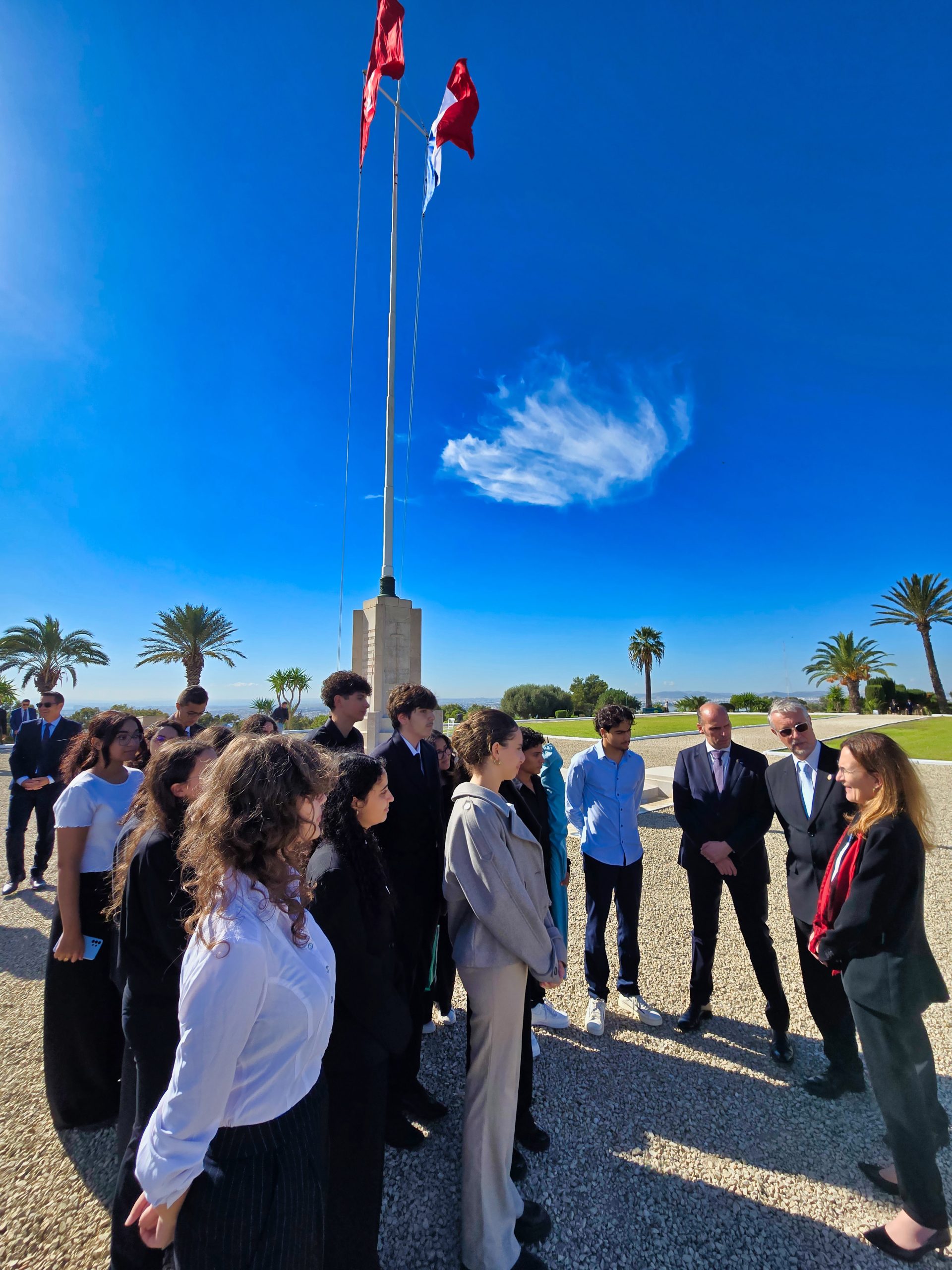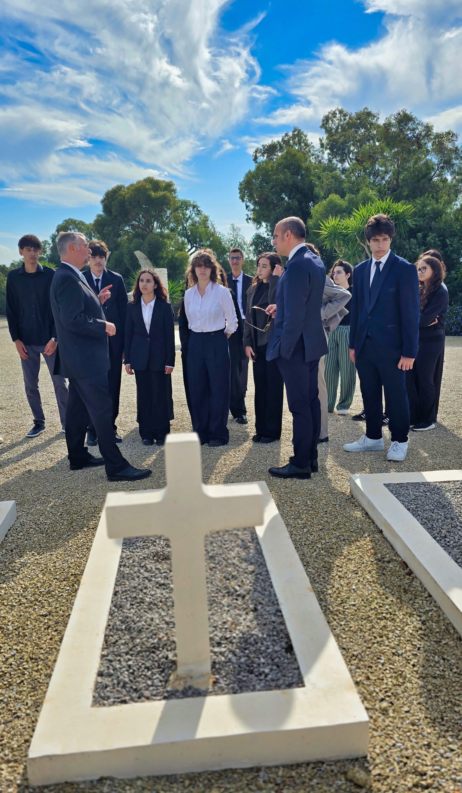 En ce 11 novembre 2025, le cimetière militaire français de Gammarth a accueilli une cérémonie empreinte d’émotion et de recueillement, en présence de Mme Anne Guéguen, Ambassadrice de France en Tunisie, de M. Dominique MAS, Consul de France en Tunisie, ainsi que du député des Français établis hors de France pour la 9e circonscription, M. Karim Ben Cheikh, ancien élève du Lycée Gustave Flaubert (La Marsa).