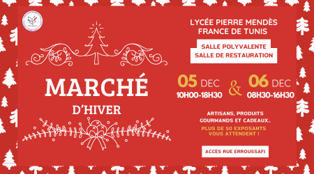 Le collège-lycée Pierre Mendès France de Tunis organise son traditionnel Marché d’Hiver les 05 et 06 décembre à PMF, en salle polyvalente et dans la salle de restauration scolaire (entrée par la rue Erroussafi – Portail Collège) .